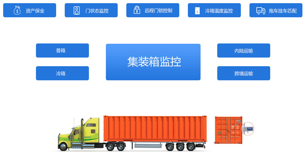 久通物联集装箱监控管理系统是一套完善的追踪系统,设计目的是对移动资产从出发地密封的那一刻起到目的地打开为止整个过程的监控和追踪。系统适用于普通集装箱、冷藏集装箱、箱式货车不同运输方式监控安全管理,同时也适用于跨境运输和内陆运输不同的运用场景。